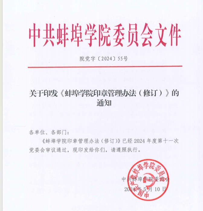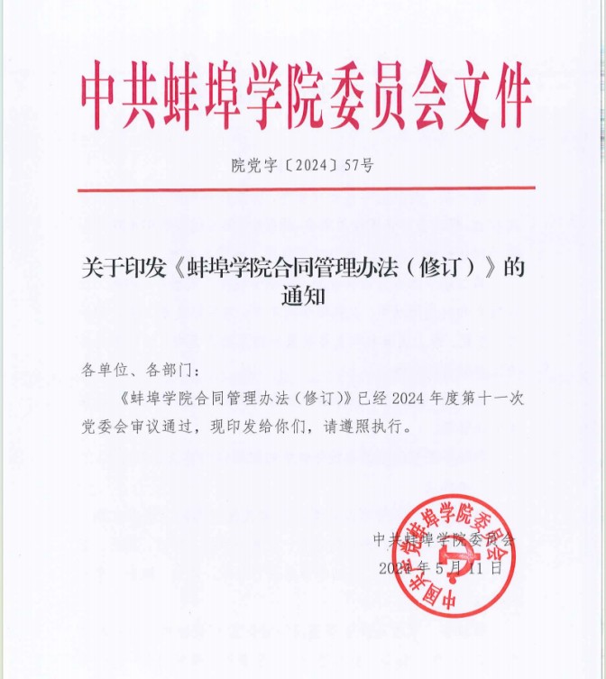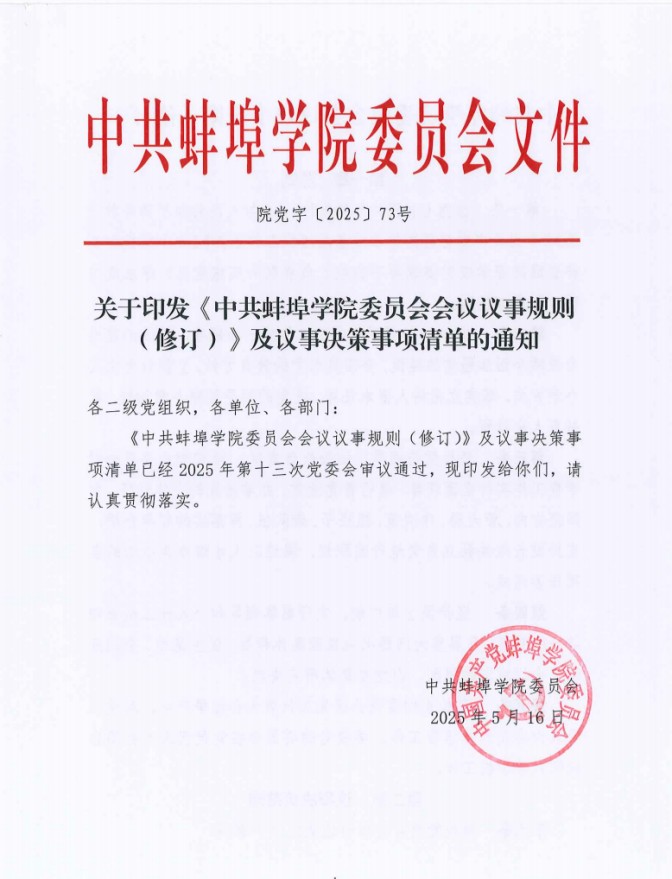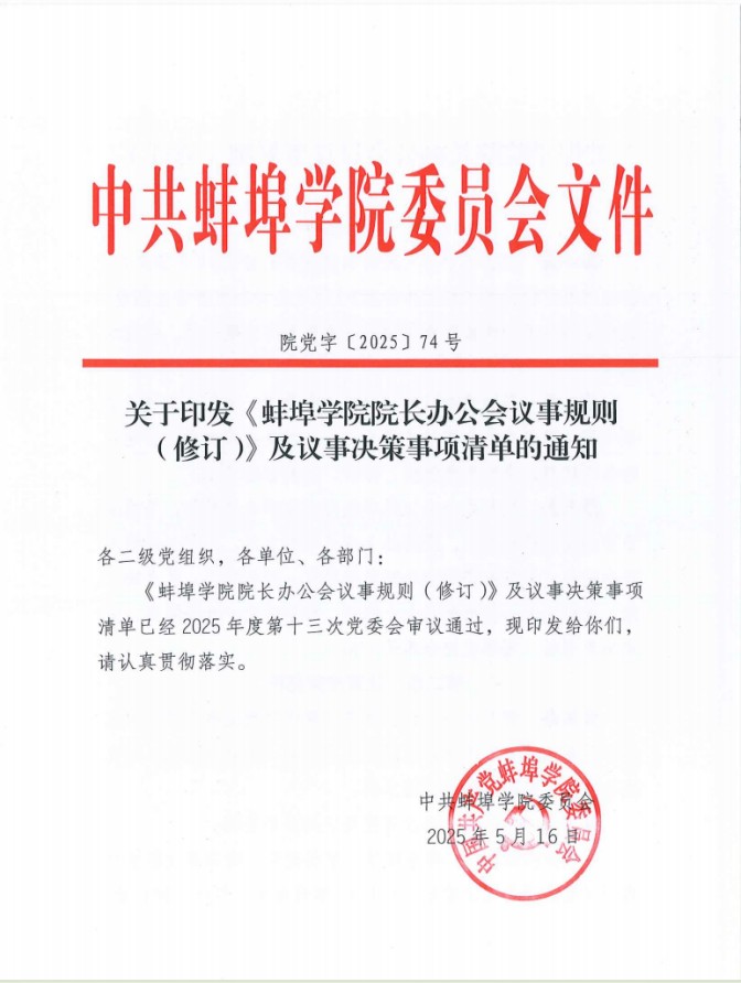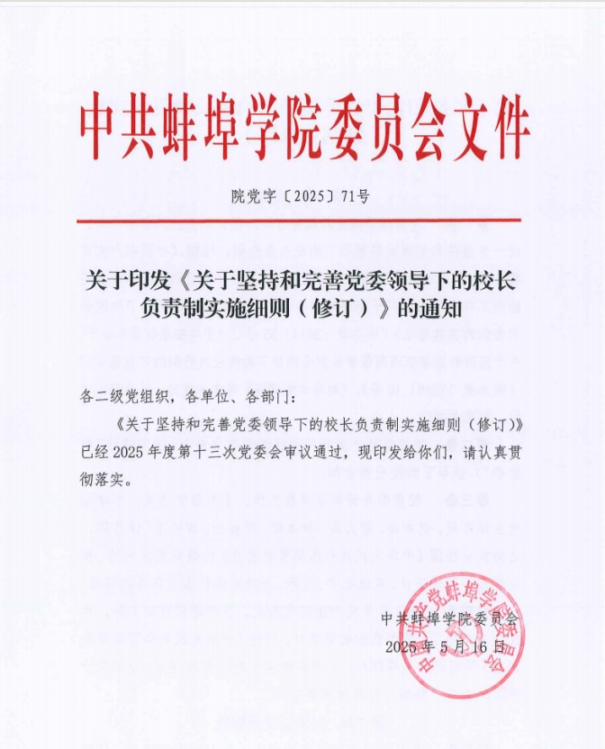 健全完善工作运行机制。修订《关于坚持和完善党委领导下的校长负责制实施细则》,明确了校党委、党委书记、校长的主要职责;修订了《蚌埠学院“三重一大”事项决策实施办法》《中共蚌埠学院委员会议事规则》《蚌埠学院院长办公议事规则》及议事决策事项清单,全面厘清了党委会、院长办公会议事边界。修订了《蚌埠学院合同管理办法》《蚌埠学院印章管理办法》,进一步规范了学校各级各类印章和合同的刻制、管理、审批和使用。开展了校内非常设机构动态调整及备案,加强校内非常设机构运行情况监督,确保非常设机构作用发挥。