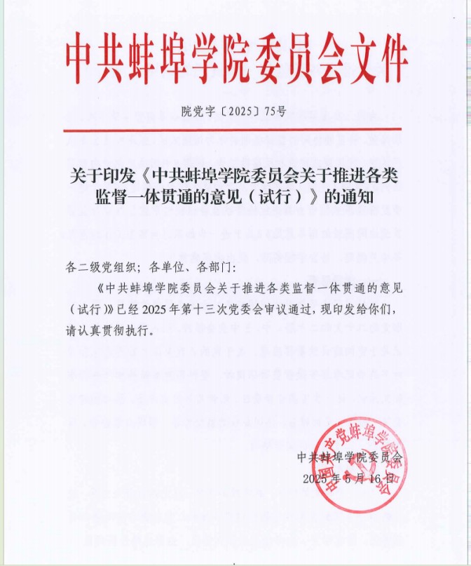 持之以恒正风肃纪。持续加强党风廉政建设责任制建设,精准有效运用监督执纪“四种形态”,一体推进“三不腐”。出台《中共蚌埠学院委员会关于推进各类监督一体贯通的意见(试行)》,推进纪委监督、巡察监督、财会监督、审计监督、组织监督等一体贯通。认真开展党纪学习教育,深入贯彻中央八项规定精神学习教育,以省委巡视整改为契机,统筹推进“1+5+1”专项整治、高校领域突出问题系统整治和全面从严治党专项整改,一体推进学查改,着力营造风清气正的发展环境。